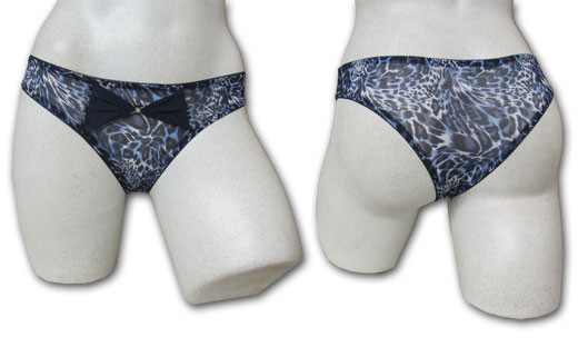 Brésilien voile strech motif Léopard. 2 rubans croisés à l'avant et resserrés par une boucle avec strass. 2 tailles.